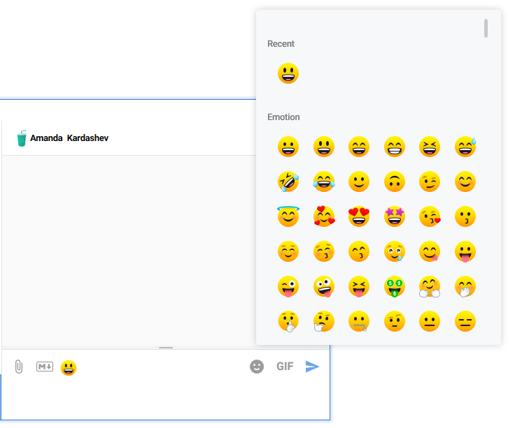 To include emojis in your message, click the smile icon in the top-right corner of the text box and pick an emoji from the gallery.